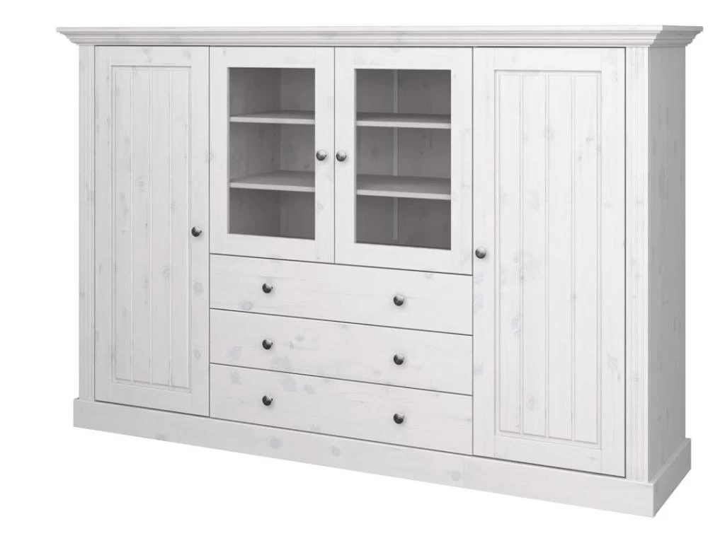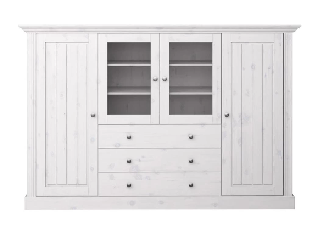Alonso Buffet 2 Portes, 2 Portes Vitrées, 3 Tiroirs, White Washed.