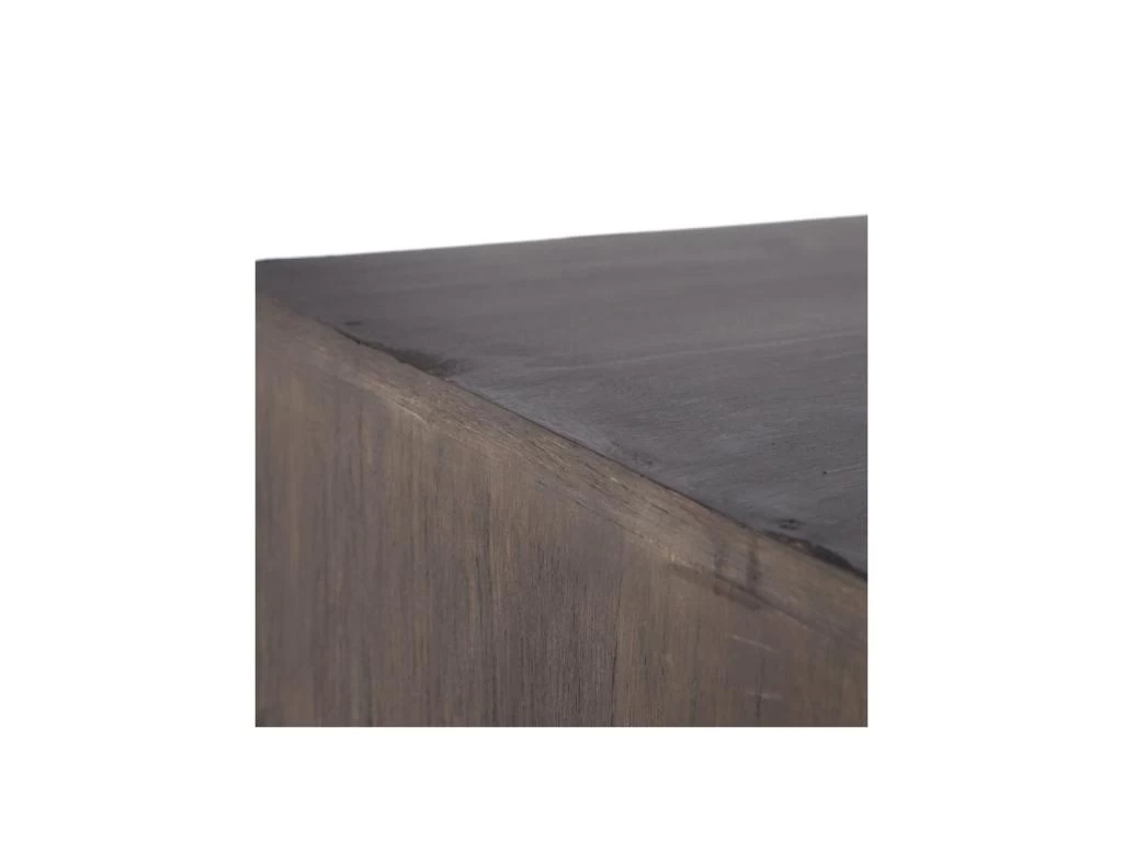 Focus sur le veinage délicat du bois de Mindi et sur le piétement modernisant.