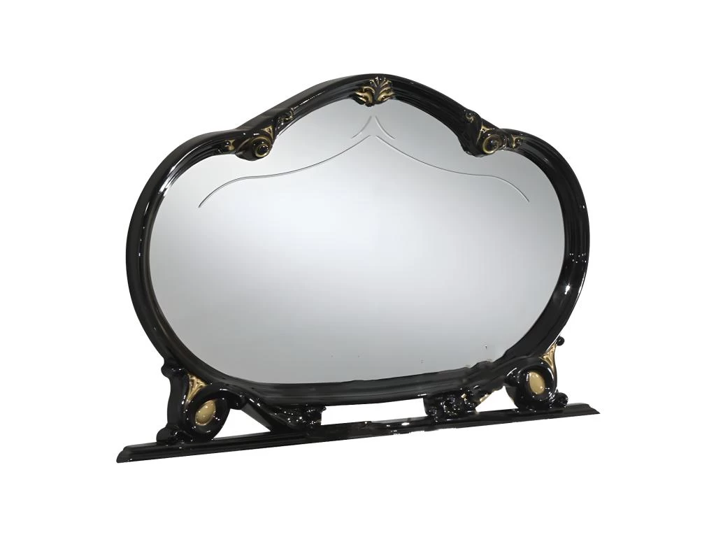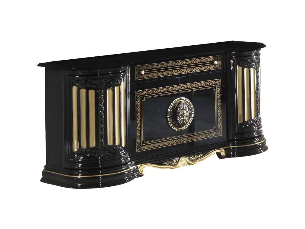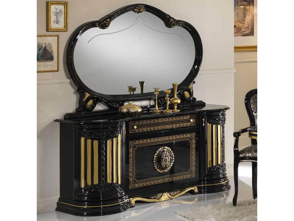 Buffet bas 4 portes 1 tiroir et son miroir pour une ambiance classique Dimensions: Buffet : L 168 x l 50 x H 78 cm ; Miroir : L 130 x l 10 x H 96 cm Matière: Panneaux de particules (18 mm épaisseur), vernis et laque noir brillant 4 portes battantes 1 tiroir avec glissières métalliques Poignées dorées Vendu avec le miroir Assemblage: Livré demonté – 78 kg – 3 colis Fabrication: italie