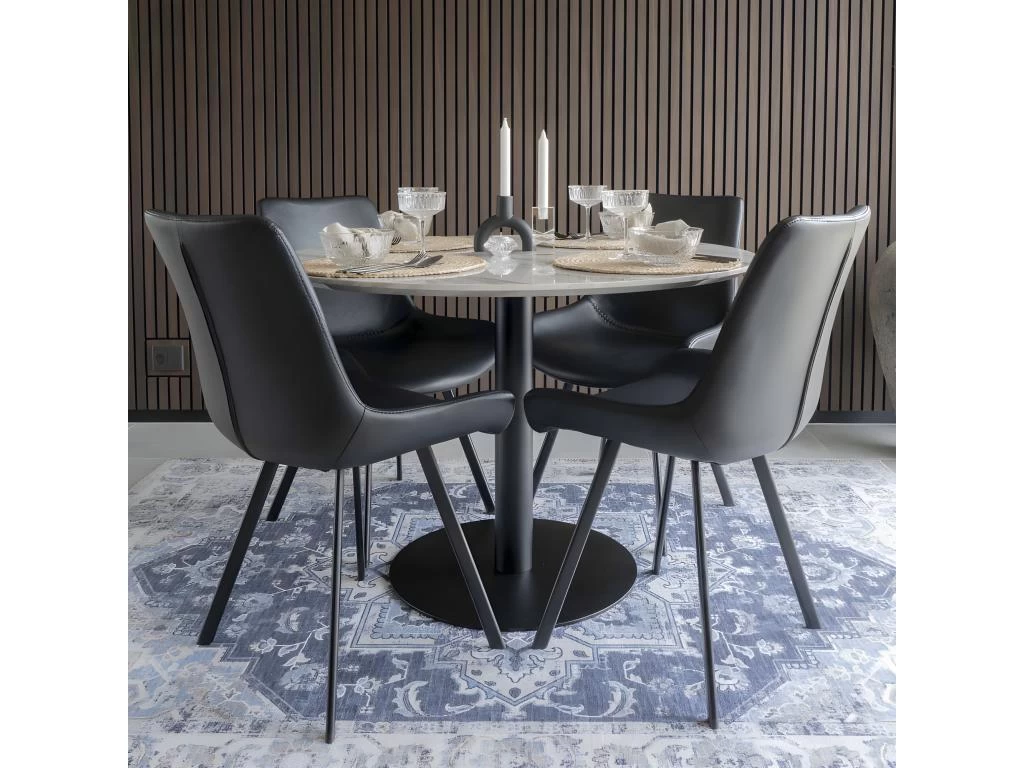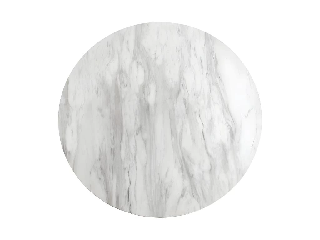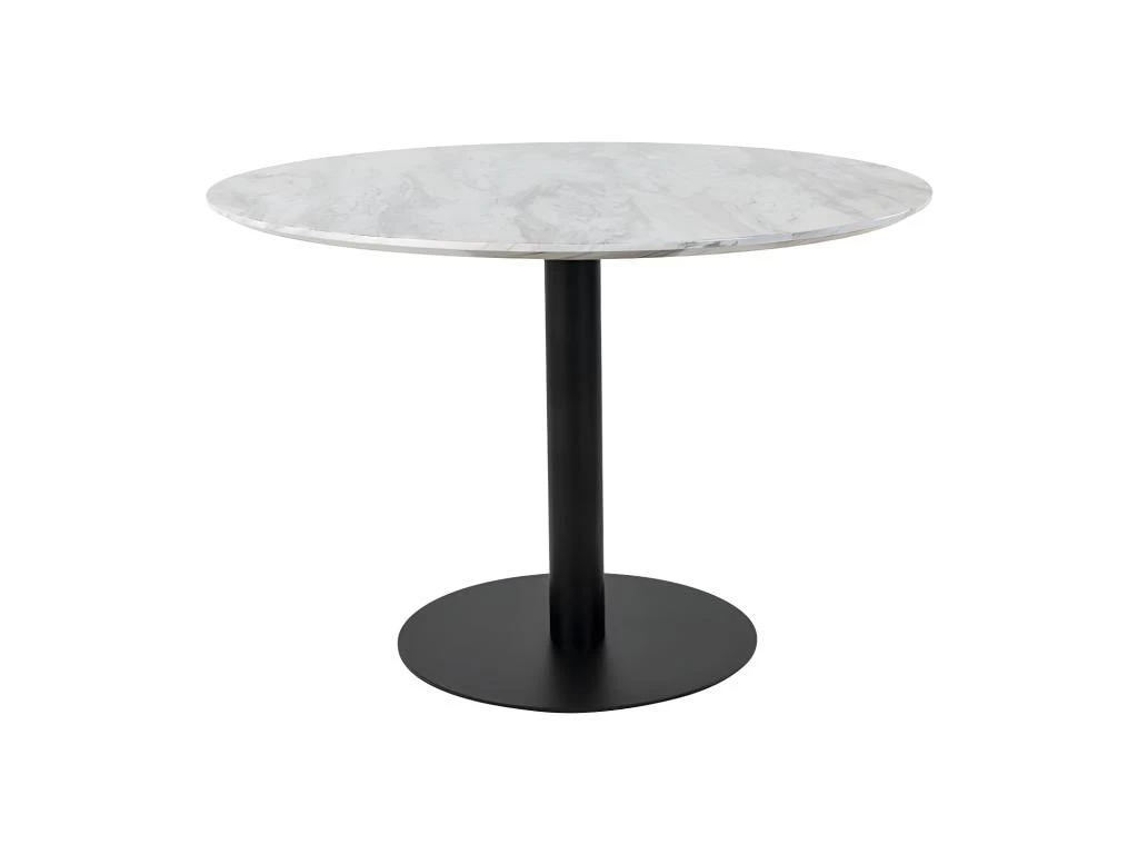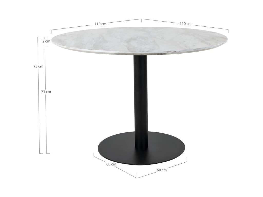 Confectionnée en acier et MDF, cette table à manger mesure 75 cm en hauteur et fait 110 cm de diamètre. Elle est composée d’un plateau rond effet marbre très élégant, puis d’un pied central cylindrique posé sur une base solide.