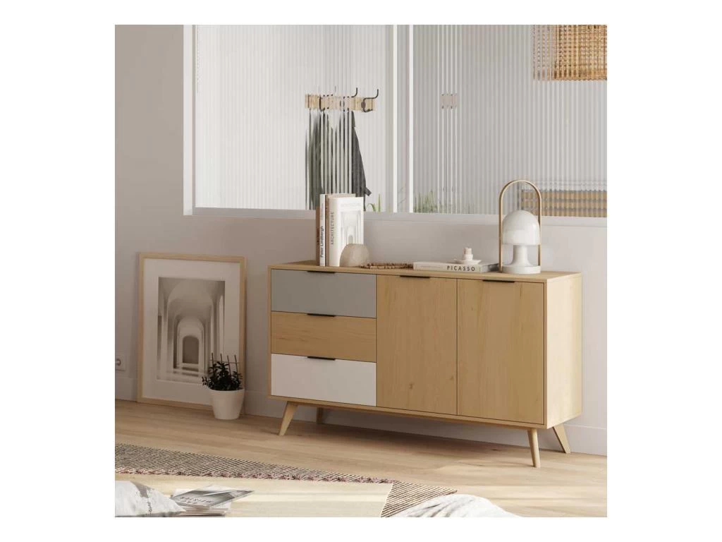 Apportez chaleur et modernité dans votre salle à manger avec ce buffet 2 portes 3 tiroirs mettant à l’honneur tous les codes du design Scandinave.