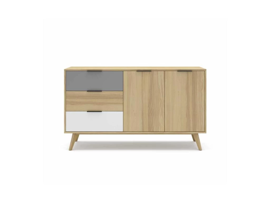 Bénéficiant d’un design aérien grâce à son piétement inspiré par les meubles Scandinaves, cette enfilade à la proportion parfaite met en avant des lignes épurées qui sont mises en relief par le bois teinte naturelle et des empiècements laqués Blanc et Gris.
