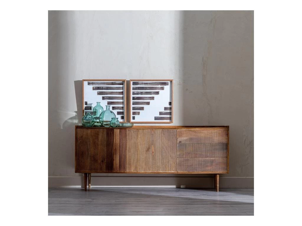 Conçue sérieusement cette enfilade fait la part belle aux détails : Beauté d’un bois légèrement blond, montage de traverses de renfort intégrées aux portes, ressaut sur le périmètre du plateau et cannelures sur les façades des ouvrants attestent d’une qualité perçue réellement valorisante.