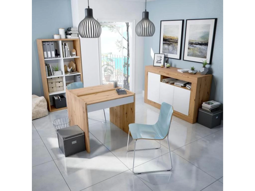 Petit bahut 144 cm blanc et chêne pour une ambiance morderne Dimensions: L 144 x l 42 x H 87 cm Matière: Panneaux de particules mélaminés (Epaisseur 15 mm) – Finition chêne à noeuds et blanc Etagères fixes – Hauteur non réglable Dimension niche : L 80 x l 42 x H 14.5 cm Poids max supporté par le meuble : 45 Kg Ideal dans une petite pièce de vie ou dans un bureau Assemblage: Livré demonté – 47 Kg – 1 colis Fabrication: espagne