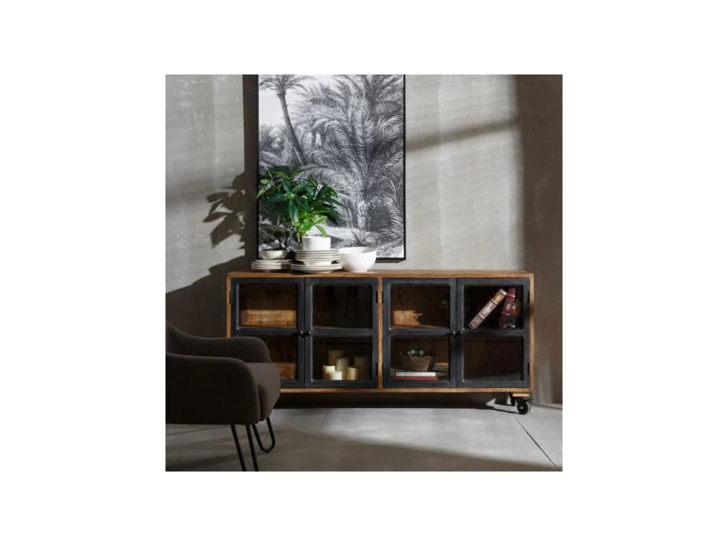Campé sur des roulettes fonctionnelles, le corps de cette enfilade met en oeuvre du bois de Manguier associé à des ouvrants réalisés en métal laqué noir et pourvus de panneaux en verre.