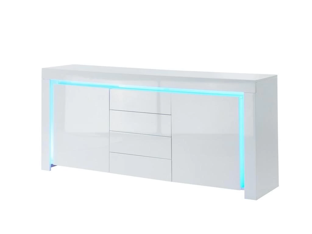 Buffet LED SUZANE 170cm – Structure en MDF – Finition laqué blanc brillant – 2 portes et 4 tiroirs – Dimensions : L170 x P40 x H75cm