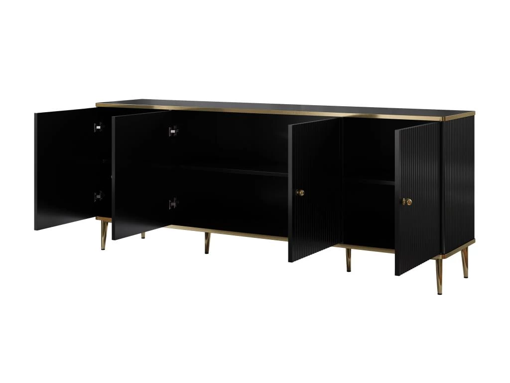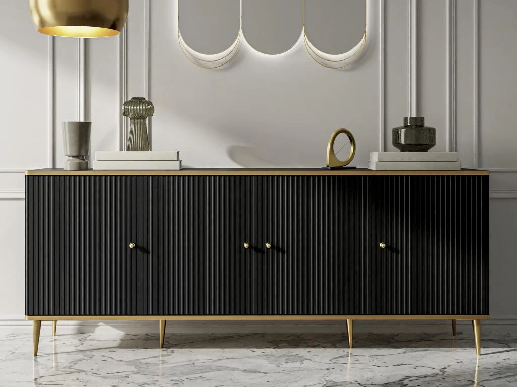 Le buffet SINEAD est le meuble idéal pour créer une ambiance sobre et distinguée dans votre séjour. Sa façade tout en relief et ses pieds et contours dorés sont gage de raffinement. Grâce à ses 4 portes et ses rangements intérieurs, vous organiserez facilement votre pièce.