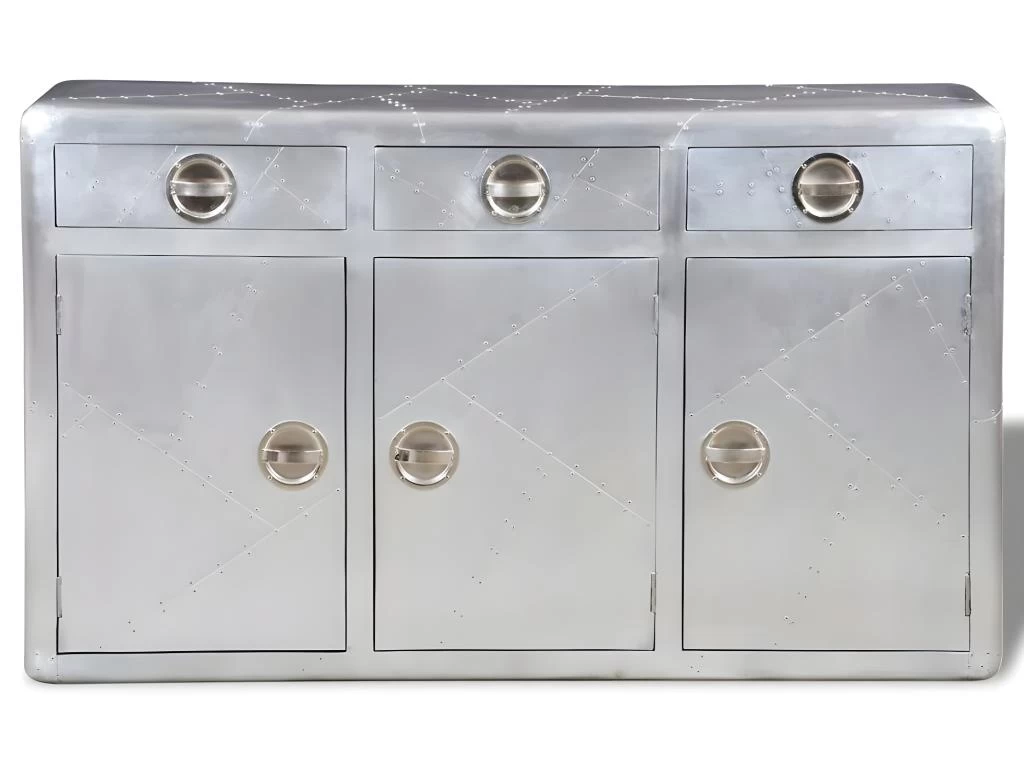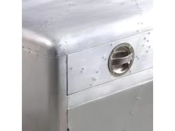 Ce buffet aviateur est fait de bois massif et sa surface est revêtue de panneaux en aluminium poli, accentuées avec des vis en acier exposées, ce qui le rend extrêmement durable.