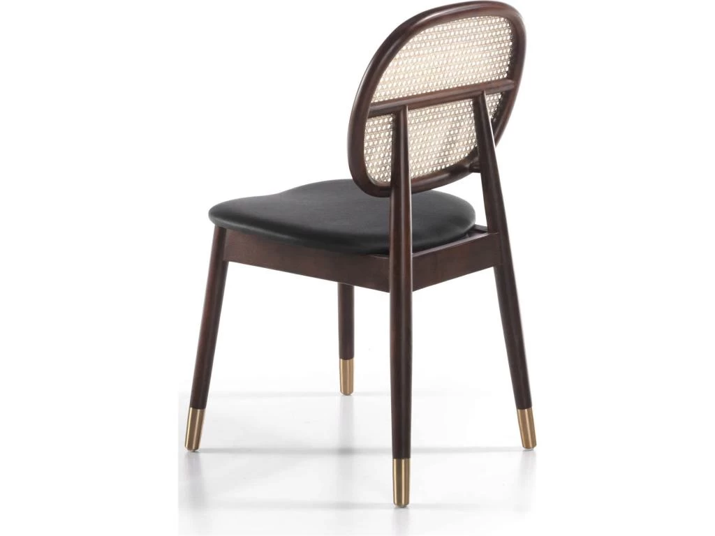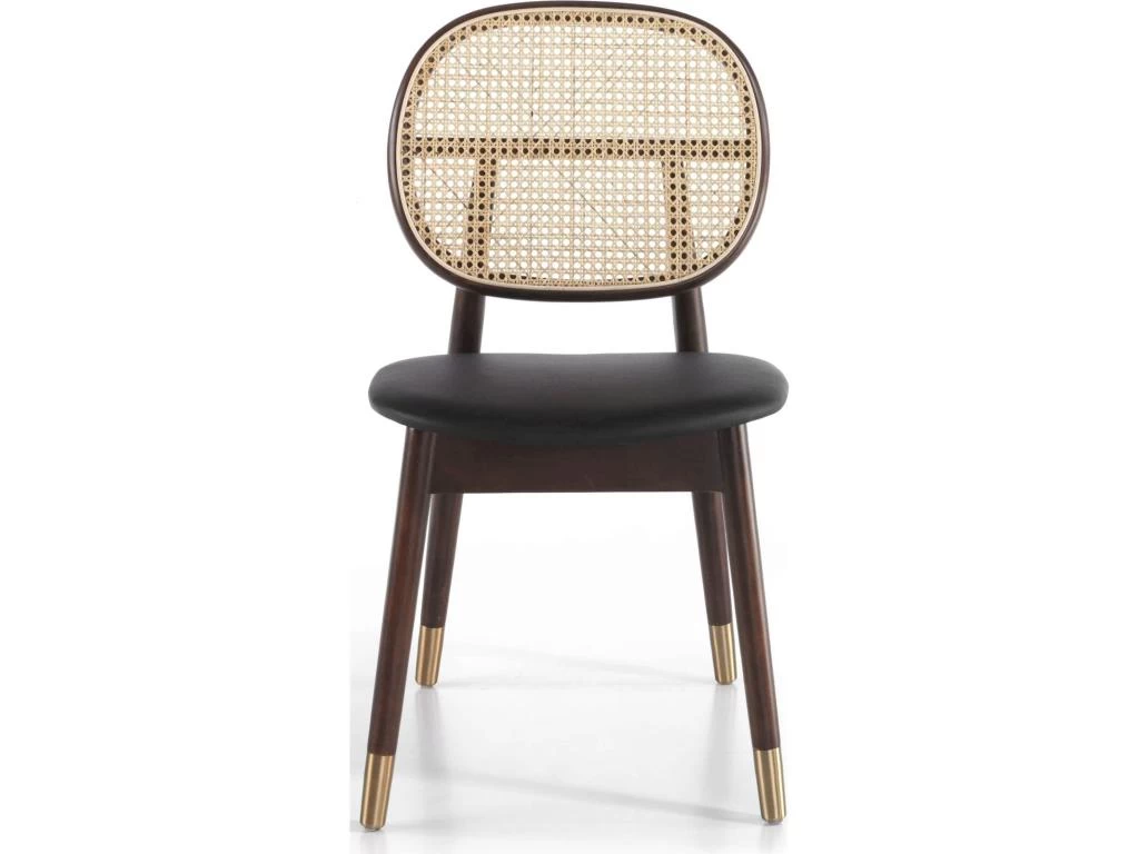 Matière : dossier : filet de rotin, assise : mousse polyester injectée densité 25 kg/m3 recouverte de similicuir (90 % vinyle, 10 % polyester), pieds : bois de frêne massif, détails : acier ,