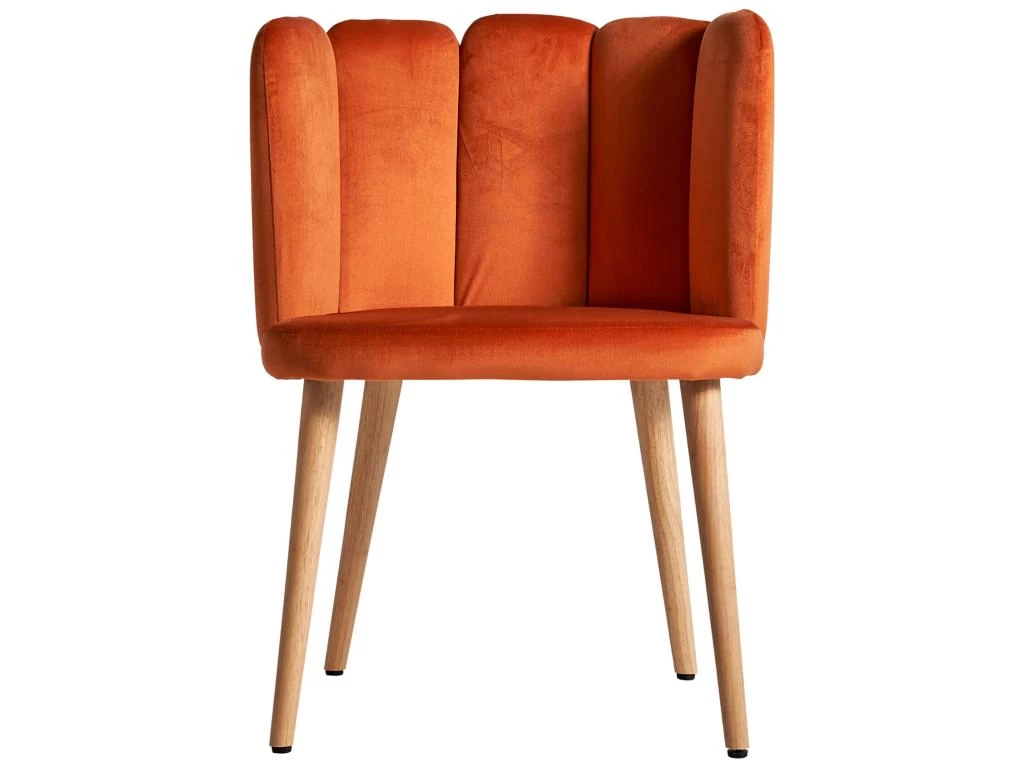 Chaise vergne, couleur orange foncé, style art déco. Fabriqué en velours, combiné avec bois d’hévéa et mousse. Produit démontable.
