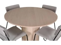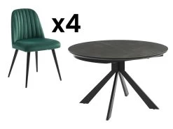 Jimmy Table de salle à manger 60-15566-468. Longueur de table extensible cm 150 / 240. Des plaques supplémentaires sont incluses. Table de salle à manger cm: L150 x P90 x H76. Table de salle à manger: 30% MDF, 70% HPL, Bois, Fer . Berit Chaise 60-15562-880. Numéro 4 . Avec accoudoirs. Chaise cm: L55 x H78 x P55. Hauteur d’assise cm: 49. Profondeur d’assise cm: 45. Largeur d’assise cm: 55. Poids maximal kg.: 200. Tissu. Velours. Chaise: 20% Polyester Lin, 80% Velours, Fer .