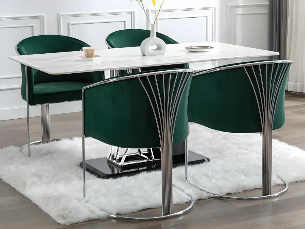 La chaise JOSETHE vous séduira par son élégance et son confort. Elle dispose d’un revêtement en velours et d’une structure travaillée en métal chromé et sera ainsi un élément idéal de décoration dans votre séjour.