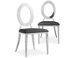 La Chaise SONIA est une chaise qualité supérieure, ultra design avec son dossier de forme ovale, et confortable de par son assise matelassée. Son look moderne et épuré conviendra à tous les intérieurs contemporains, et sa structure en métal effet miroir ultra chic apportera glamour et cachet à votre salle à manger. N’hésitez plus et succombez au charme de ce lot de 2 chaises modernes !