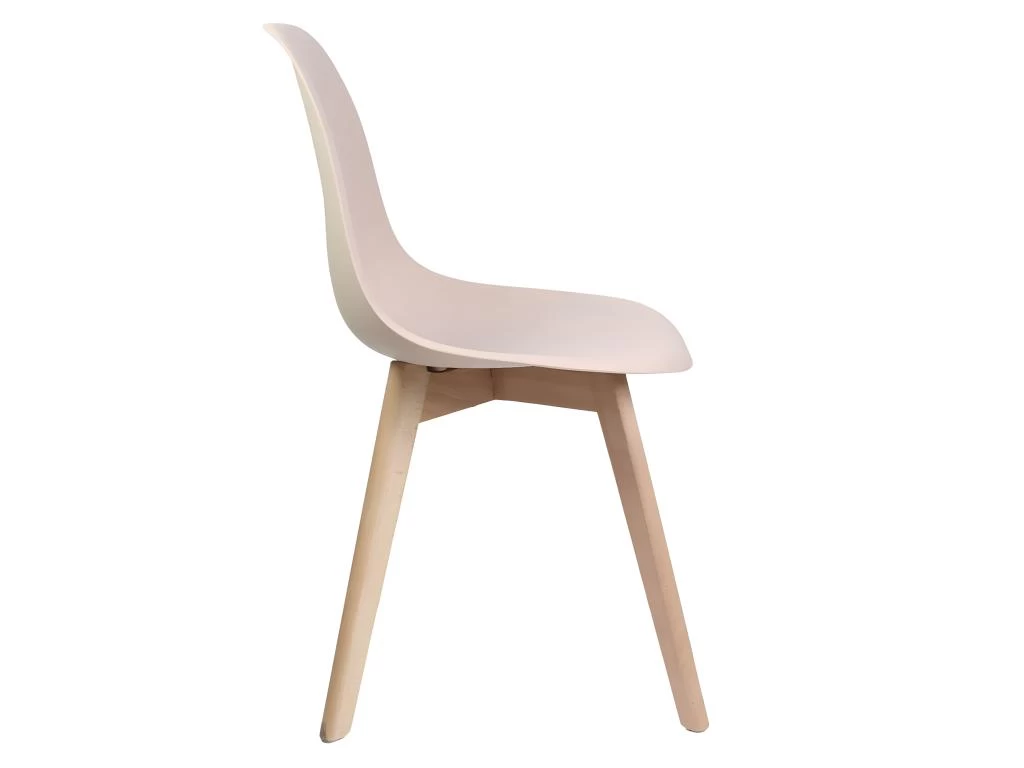 Piétement en bois massif naturel. Coque en poluéthylène coloris rose. Hauteur d’assise : 42 cm.