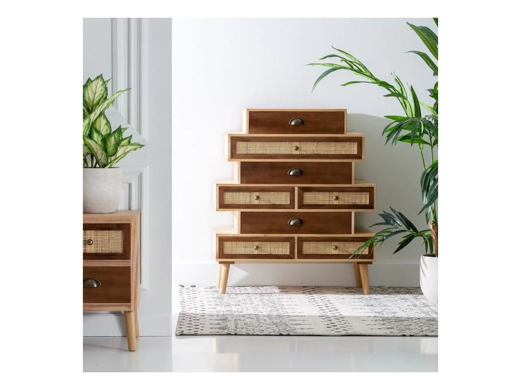 Matériaux naturels et design inspiré du mobilier cottage pour ce surprenant meuble d’entrée 8 tiroirs au look original et néanmoins consensuel.