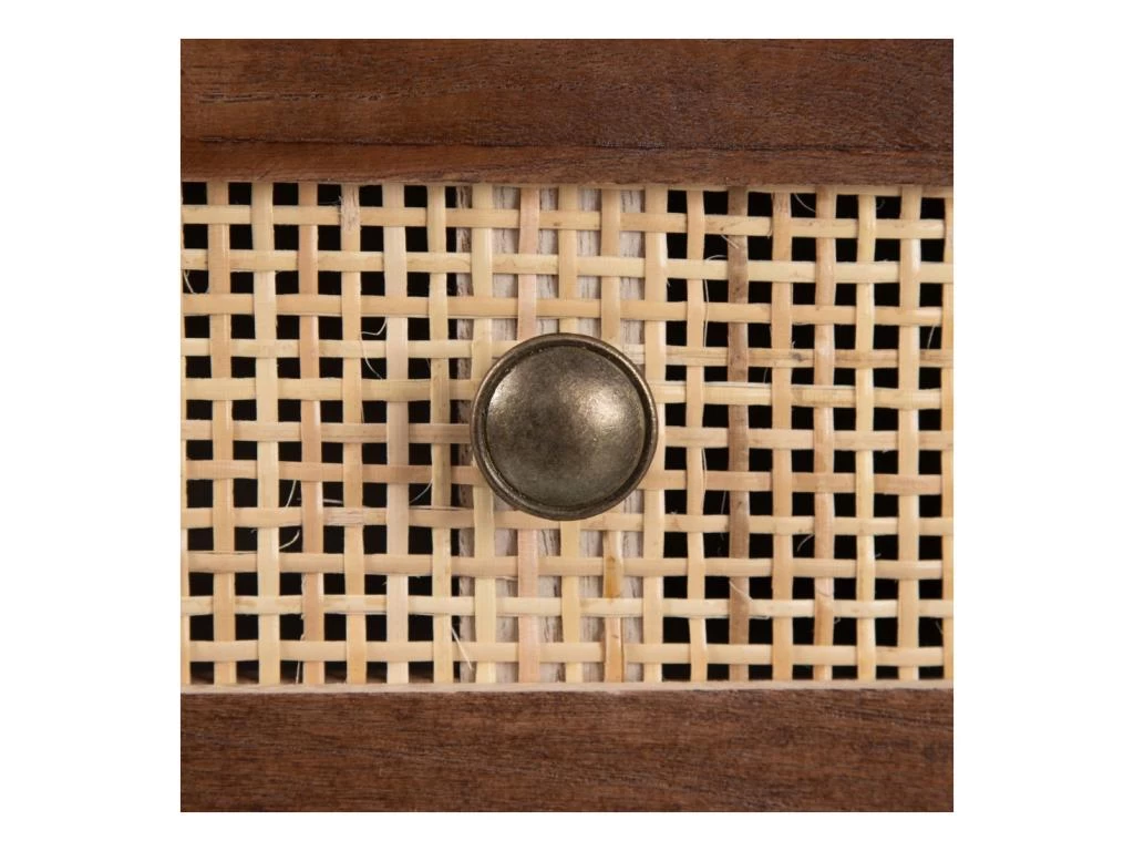 Toute la chaleur du bois est ici soulignée par des façades de tiroir en cannage tressé, ces tiroirs sont mis en relief par des poignées fantaisie issues de meubles de métiers.