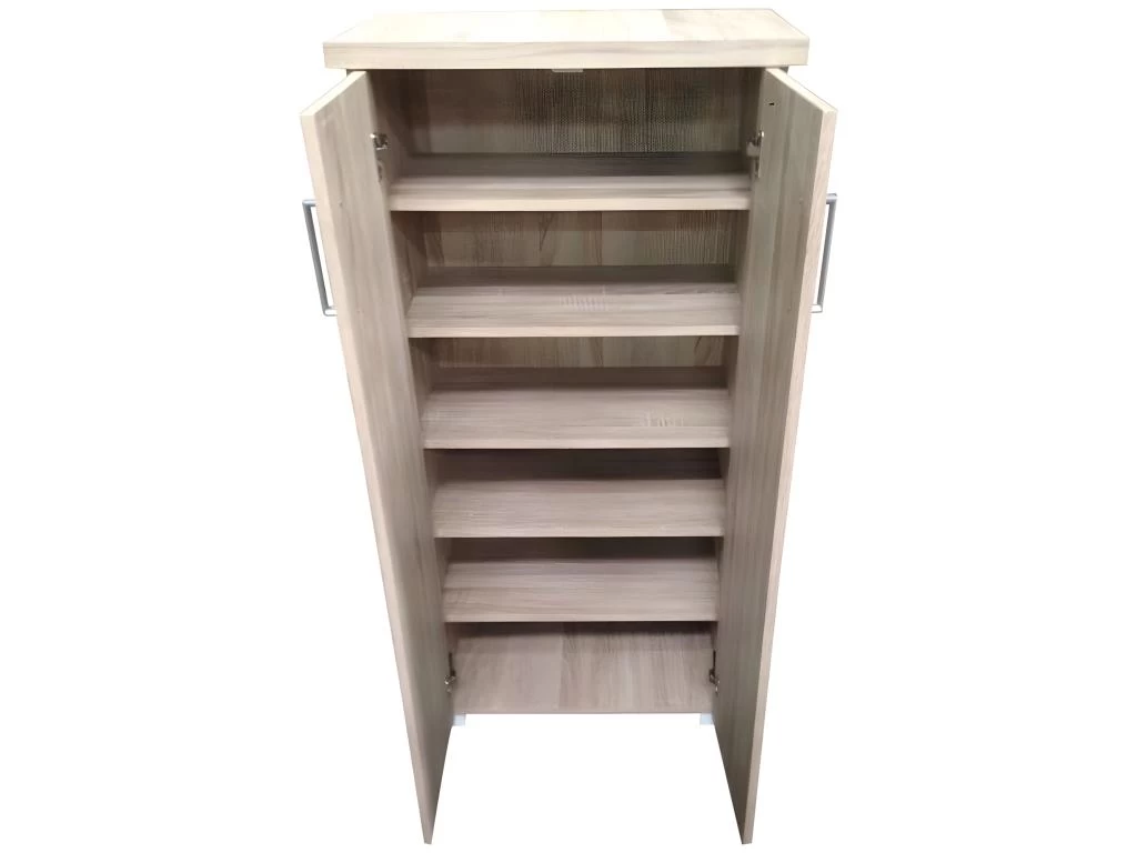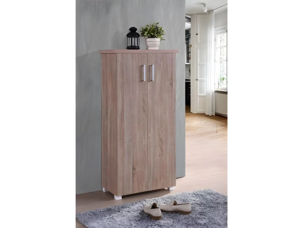 Le meuble de rangement MARMARIS sera idéal dans votre entrée ou votre buanderie. Avec ces deux portes hautes et ces six niveaux d’étagères il vous rendra service. En bois aggloméré de haute qualité de coloris Sonoma, ces poignées grises et ces pieds blancs, son look fera partie intégrante de votre pièce.