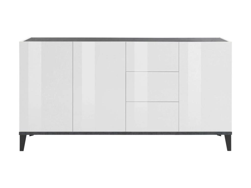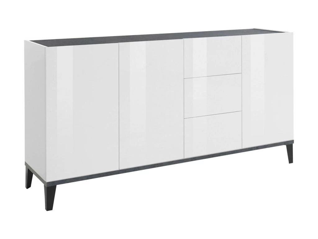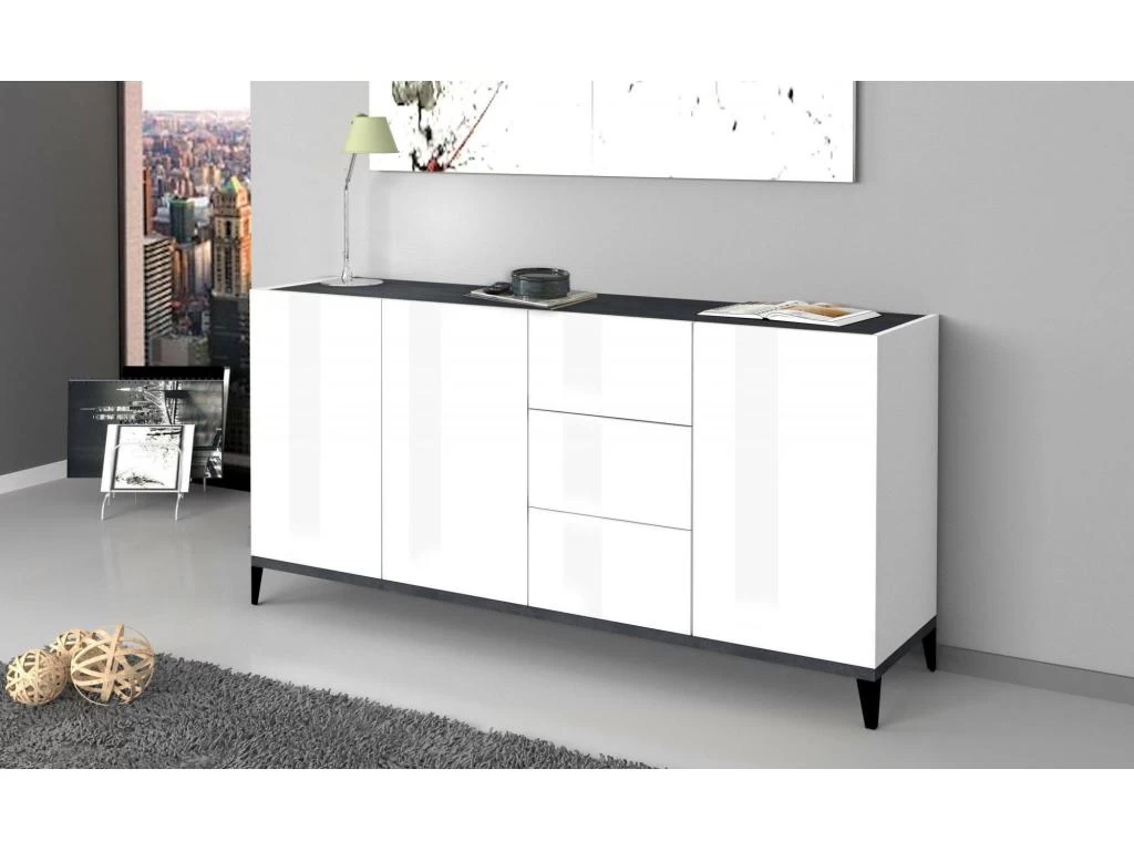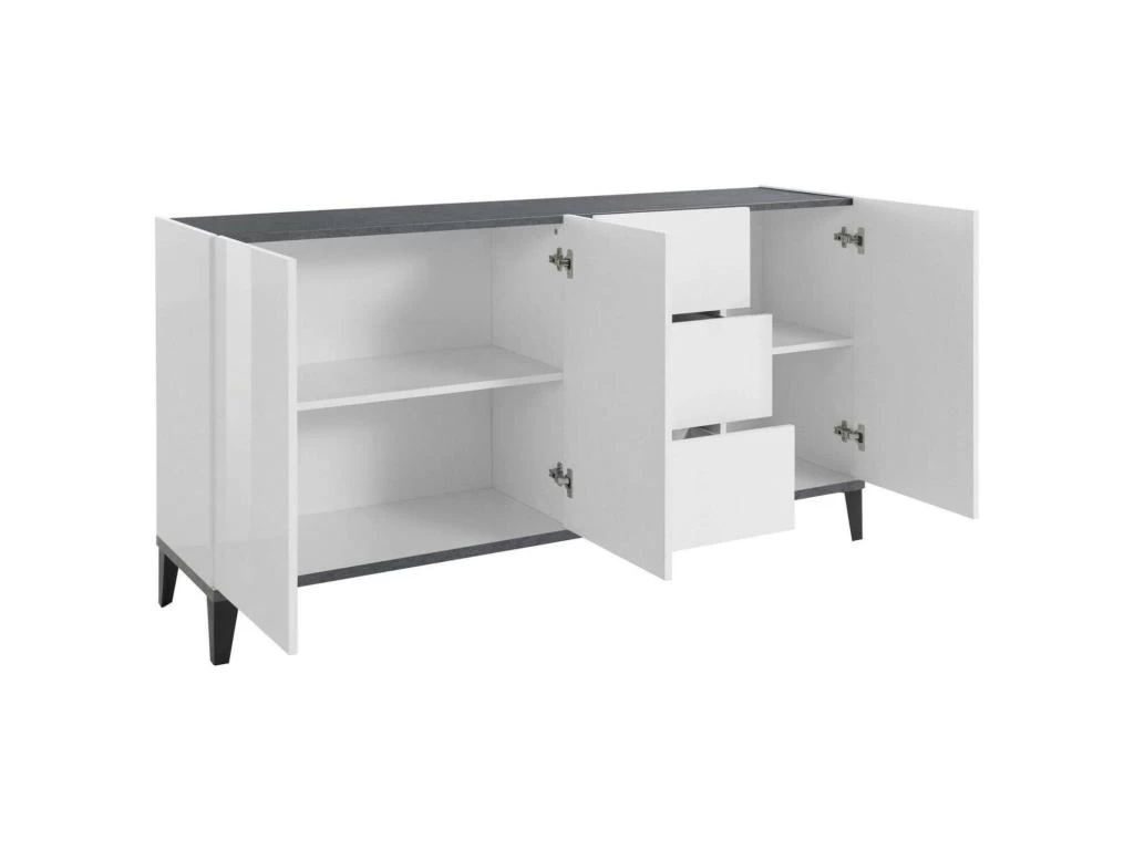 STRUCTURE ET UTILISATION – Buffet de salon pratique et peu encombrant structuré avec trois portes et trois tiroirs, structuré à l’intérieur avec des étagères confortables – Les portes et les tiroirs sont sans poignées, tous deux équipés de charnières solides et de guides métalliques, l’ouverture se fait par push-pull système – La structure est entièrement en blanc brillant et ardoise – L’étagère supérieure est parfaite pour accueillir votre téléviseur ou vos bibelots préférés.
