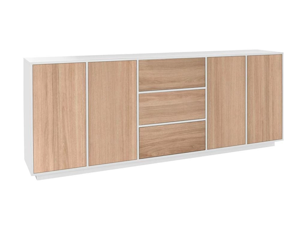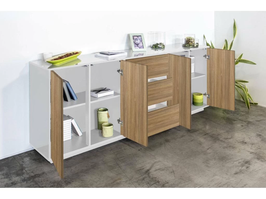 STRUCTURE ET UTILISATION – Meuble de salon pratique et peu encombrant structurĂ© avec trois tiroirs centraux et quatre portes battantes latĂ©rales avec huit Ă©tagères – Les portes et les tiroirs sont sans poignĂ©es tous deux Ă©quipĂ©s de charnières solides et de glissières mĂ©talliques – L’Ă©tagère supĂ©rieure fait de ce buffet un meuble TV oĂą ranger vos bibelots prĂ©fĂ©rĂ©s – Ce meuble est parfait pour dĂ©corer la salle Ă manger, le salon, le couloir, l’entrĂ©e ou le bureau, contenant de la vaisselle, des verres, des nappes, des couverts, des livres, des documents ou des objets dĂ©coratifs de manière ordonnĂ©e.