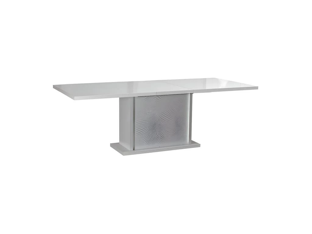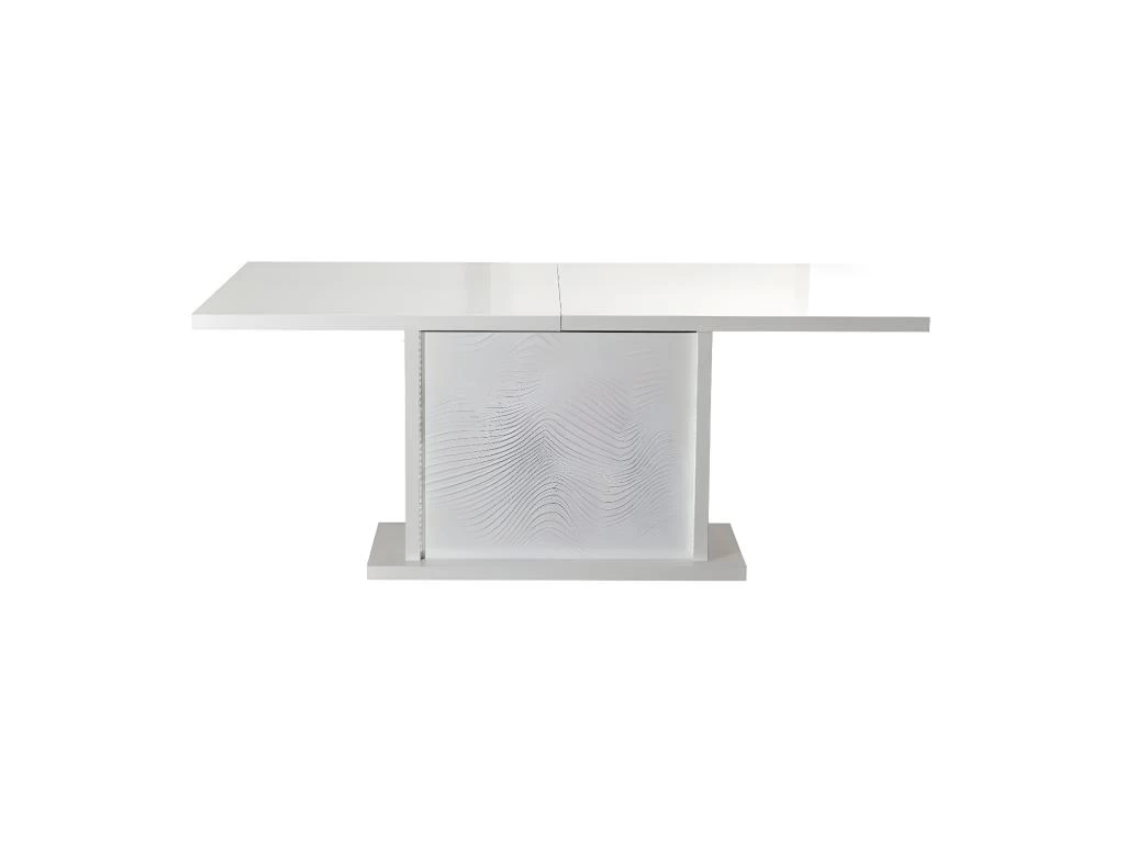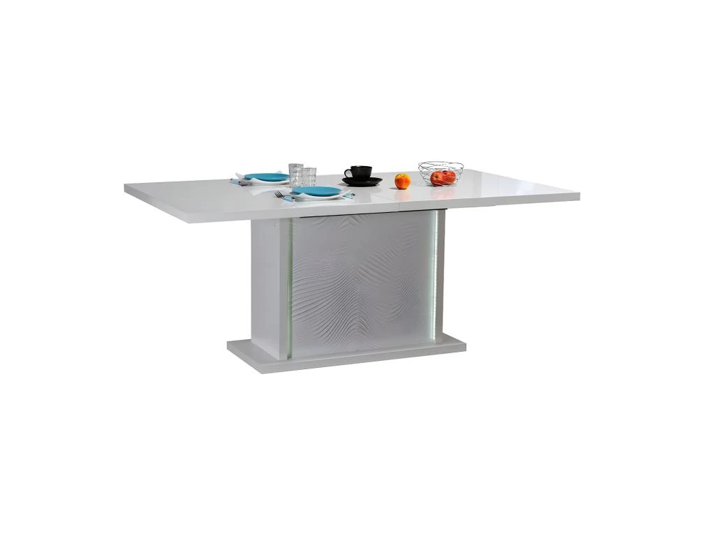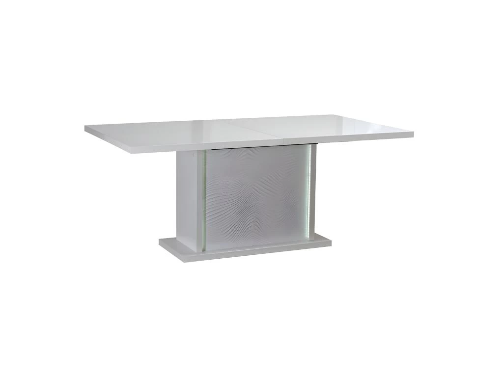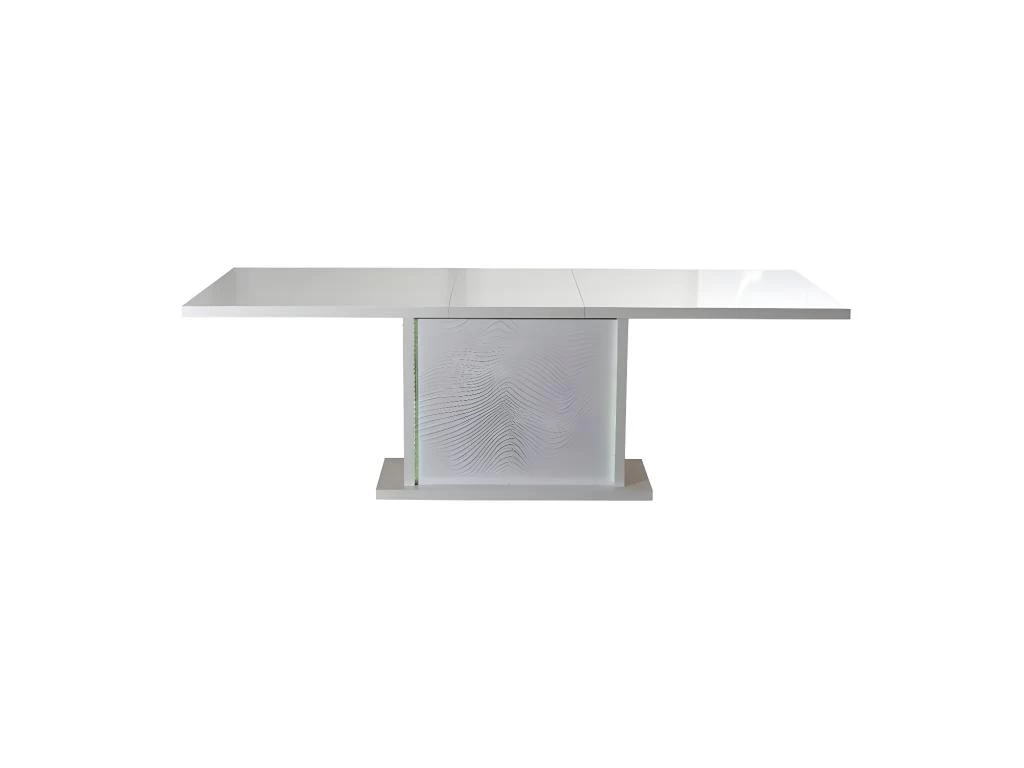 Cette table à manger propose un piétement central agrémenté de panneaux au surprenant relief ondulation, encadrés par des empiécements qui diffusent la lumière des LED’s intégrées dans le caisson pieds.