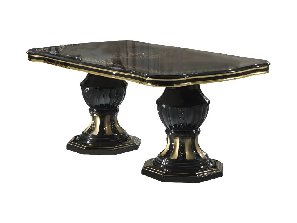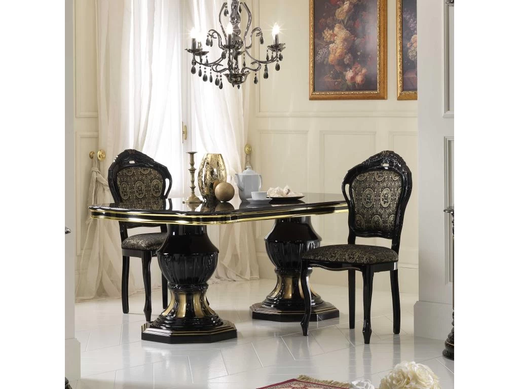 Table de repas ovale 185/230 cm noir et or pour une salle à manger classique Dimensions: Table de repas : L 185/230 x l 105 x H 75 cm Matière: Panneaux de particules (18 mm épaisseur), vernis et laque noir brillant Allonge centrale de 45 cm Plateau de table en MDF Table pour 8 à 10 personnes Assemblage: Livré demonté – 68 kg – 3 colis Fabrication: italie