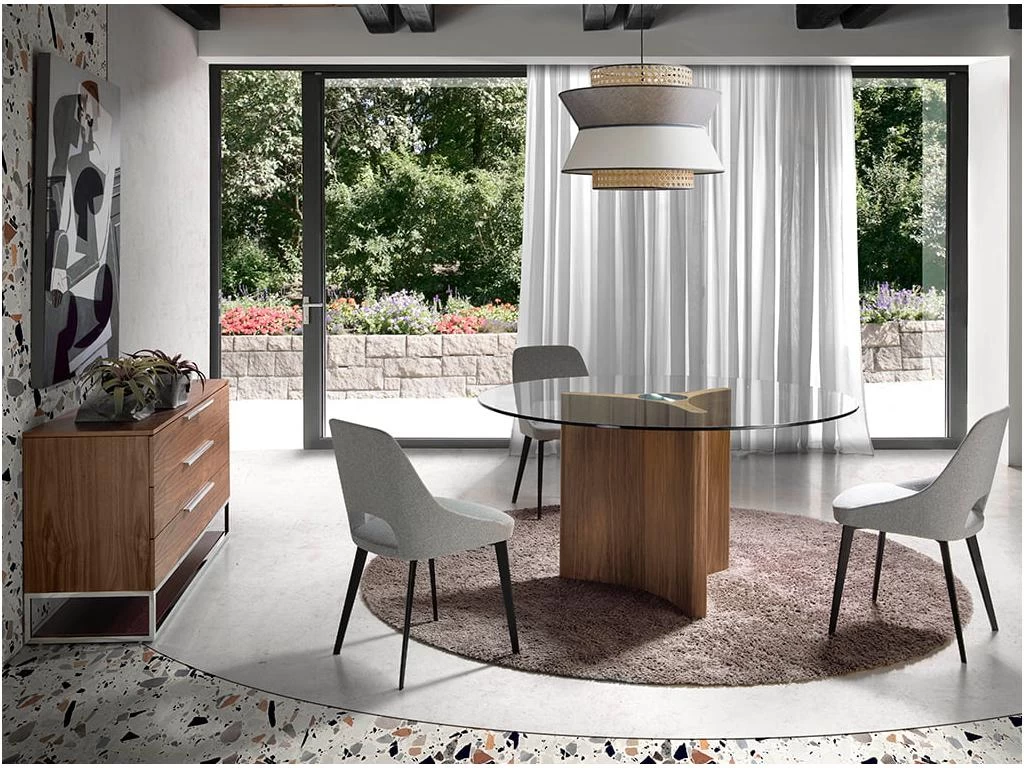 Table de salle à manger ronde au design moderne avec plateau fixe en verre trempé de 15 mm et bords polis. Sa base originale en bois de pin massif avec placage en noyer naturel de 0,5 mm d’épaisseur apporte chaleur et lumière à l’espace. Une pièce qui se caractérise par son style élégant et sobre, parfait pour ses dimensions, tant pour la salle à manger que pour la cuisine