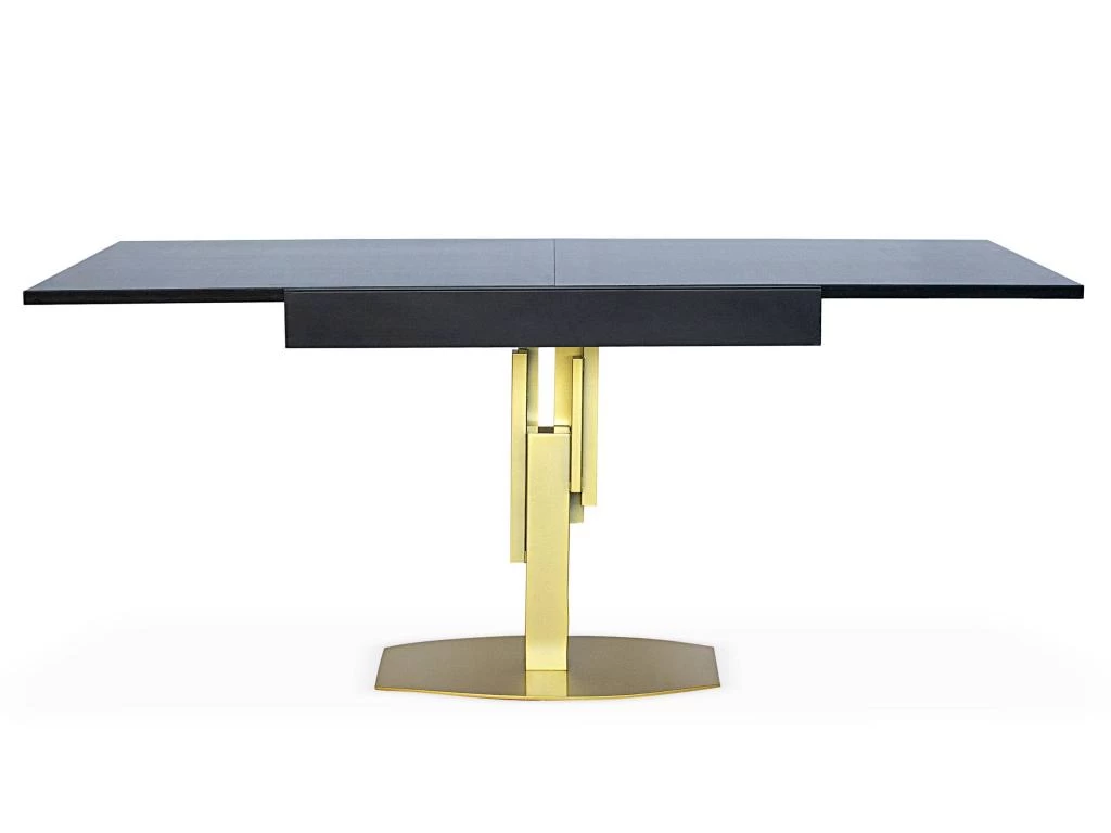 Nous vous présentons la table MEALANE, une table carrée au pied central remarquable en métal doré, très architectural.