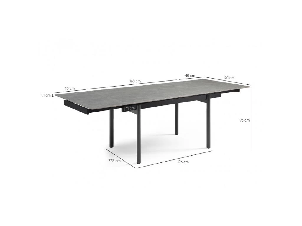La table personnalisée adaptée à vos envies ! Son plateau en céramique pleine masse de 11mm gris marbré mat est lumineux et robuste. Attablez jusqu’à 10 personnes grâce à ses 2 rallonges intégrées de 40 cm chacune, pratiques, et simple d’utilisation. Elle passe ainsi de 160 à 240 cm. Son plateau en céramique lui confère des qualités remarquables : résistance aux rayures, insensible aux taches diverses, et ne craint pas les différences de températures. Ses 4 pieds droits en métal noir vous assurent stabilité et finesse !
